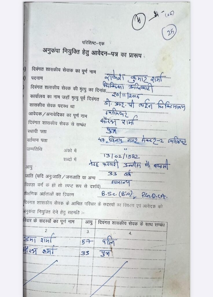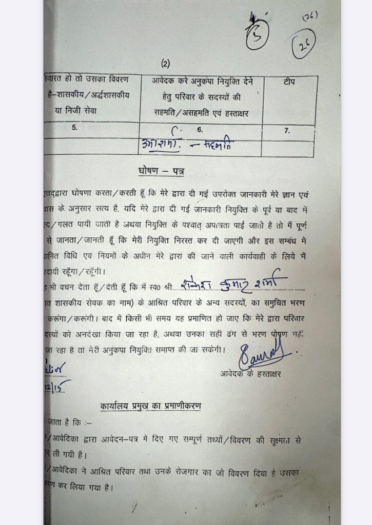 '100अरब शर्मा', जिनकी नियुक्ति के लिए भूपेंद्र सिंह परिवहन मंत्री रहते हुए प्रयास कर रहे थे, उनकी नियुक्ति के लिए दो अन्य मंत्री भी प्रयास करते रहे। शर्मा और उनकी मां ने अपने बड़े भाई के बेटे की जानकारी छिपाते हुए तत्कालीन सीएमओ ग्वालियर को अनुकंपा नियुक्ति का आवेदन दिया था। इस फर्जी आवेदन को सभी तथ्य जानने के बाद भी प्रमाणित कर दिया गया और मूल आवेदन जिला कलेक्टर ग्वालियर को भेज दिया गया।