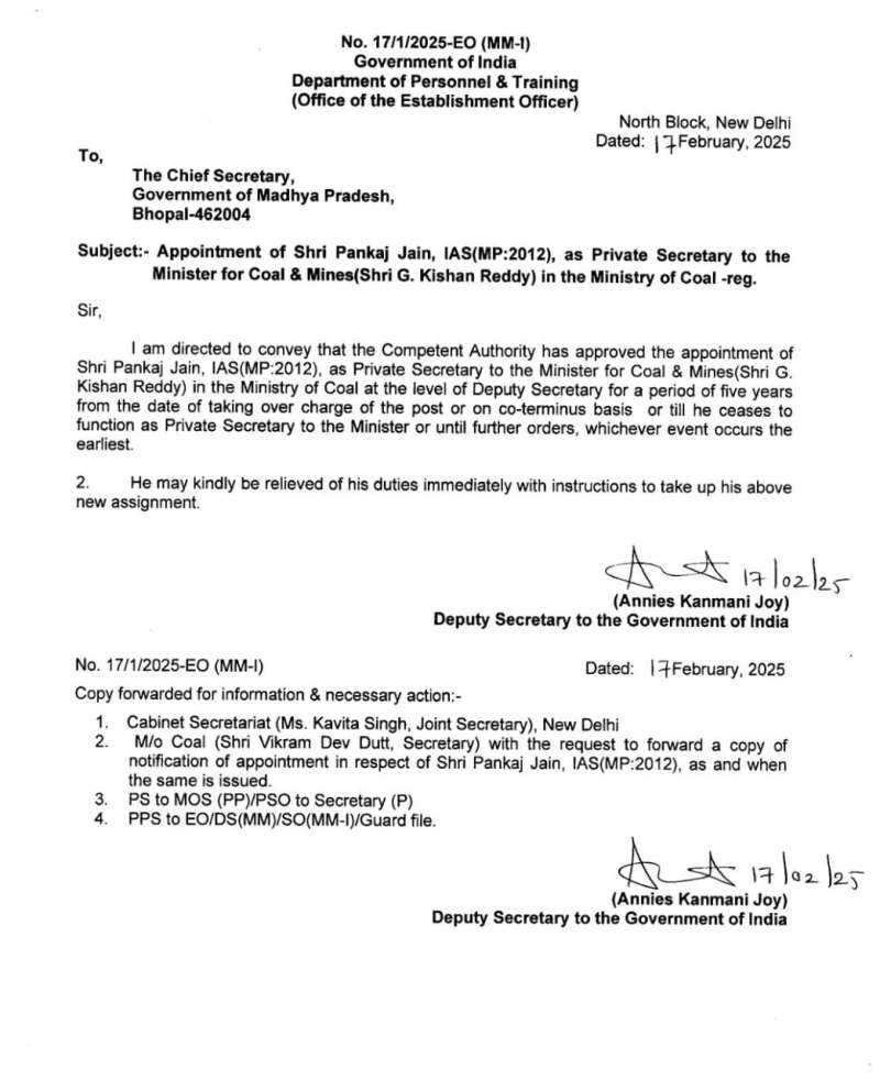 पंकज जैन को केंद्रीय कोयला एवं खान मंत्री का निजी सचिव नियुक्त किया गया